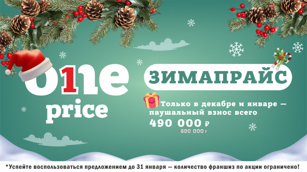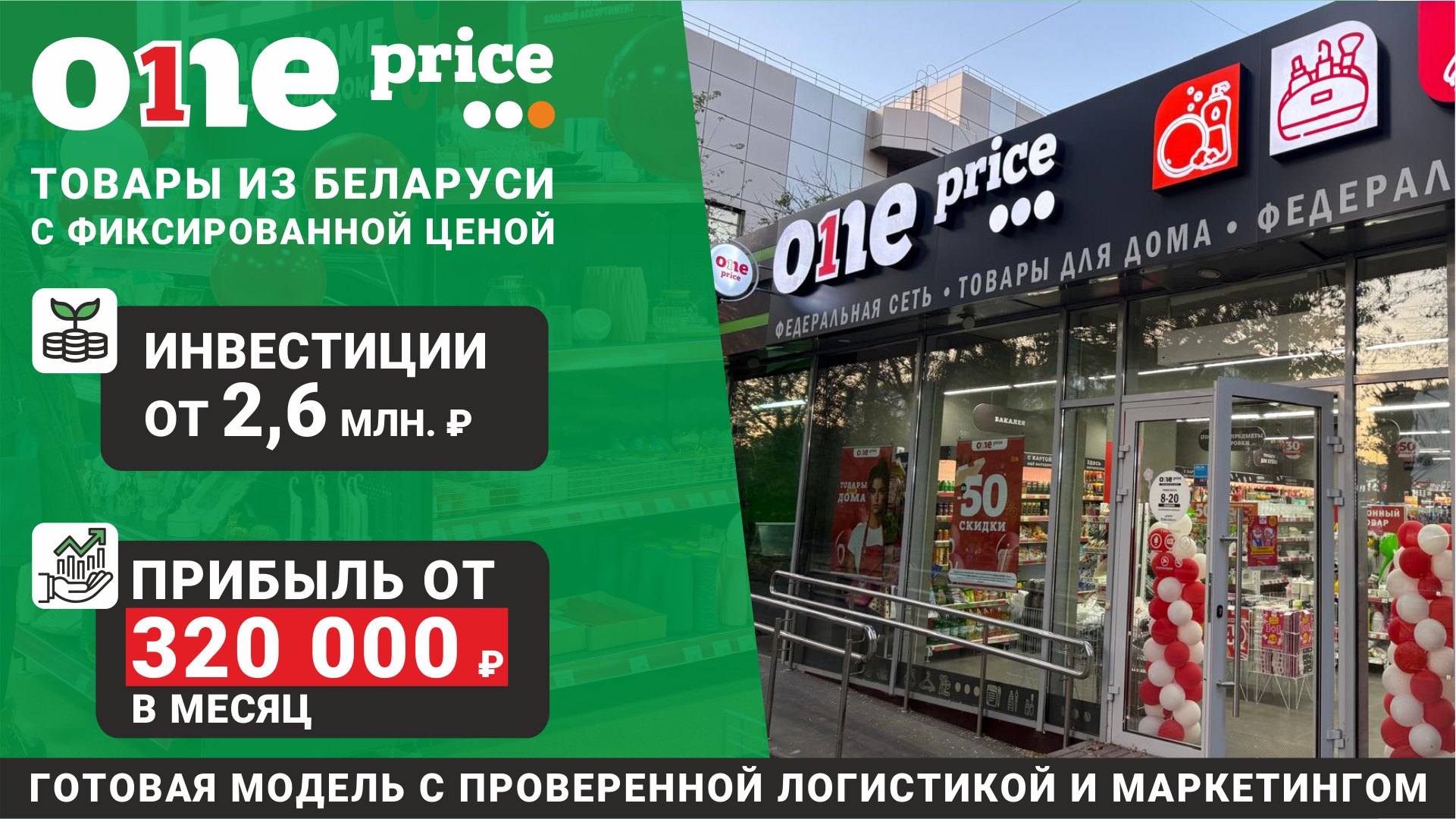 One PriceСтоимость490 000 ₽Инвестиции2 600 000 ₽Окупаемость12 мес.Доход320 000 ₽Франшиза One Price — бизнес с предсказуемым доходом. 350+ магазинов сети, стабильный спрос и фиксированные цены. С нами вы получите уникальные товары, которых нет на полках федеральных сетей и витрине маркетплейсов. А также индивидуальные скидки от поставщиков, обучение в Академии для франчайзи, запуск за 21 день! Мы работаем по проверенной белорусской модели бренда: высокий спрос, быстрая окупаемость, стабильный доход на растущем рынке доступного ритейла. Минимум рисков — максимум поддержки!