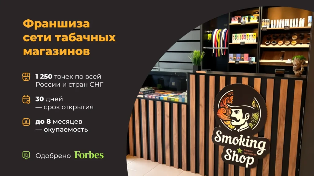 Smoking ShopСтоимость590 000 ₽Инвестиции900 000 ₽Окупаемость6 мес.Доход300 000 ₽Открытие табачного магазина – это возможность войти в стабильный рынок. С 2015 года нами было открыто 1250+ магазинов по России и СНГ. Наши франчайзи получают до 300 000 рублей ежемесячной прибыли благодаря высокой наценке на товар – до 400%. Рынок табачных изделий, вне зависимости от ситуации на рынке, продолжает рост и, по данным аналитиков, к 2031 году увеличится на 15%. Мы обеспечиваем вас обучением, поставками и дизайном. Запустите магазин по проверенной модели и начните получать доход с первых месяцев работы!
