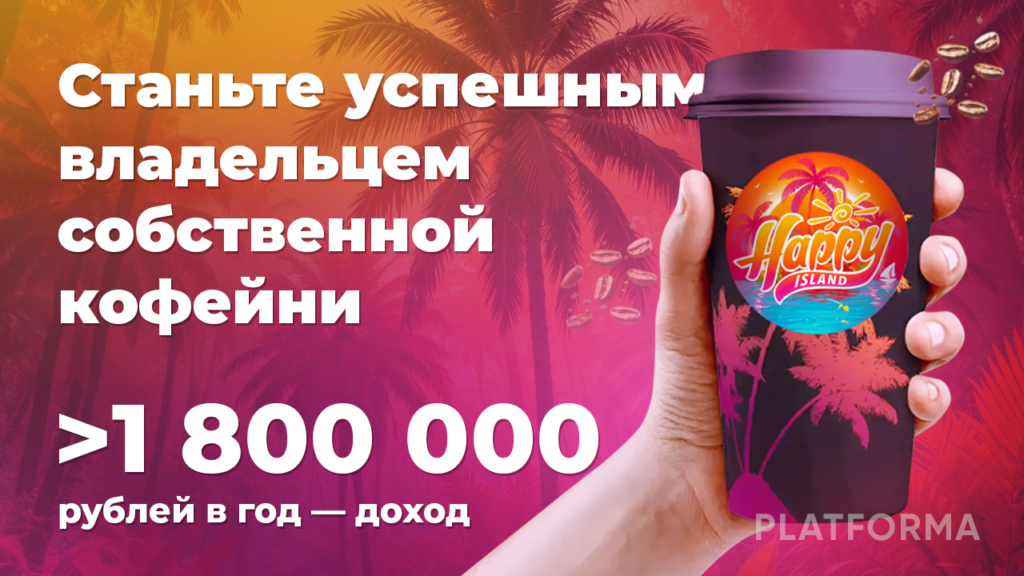 Happy IslandСтоимость500 000 ₽Инвестиции1 300 000 ₽Окупаемость8 мес.Доход250 000 ₽Happy Island – мультиформатная франшиза кофейни. 7 форматов ведения бизнеса на выбор. Вы сможете зарабатывать от 250 000 рублей в месяц.. Наш стильный формат поможет вам достичь успеха, 40 кофеен уже успешно работают, 60 на стадии запуска. Рынок демонстрирует активный рост, а наш бренд, обладающий высокой узнаваемостью и узнаваемой визуальной идентичностью, гарантирует стабильный доход и долгосрочную перспективу развития.