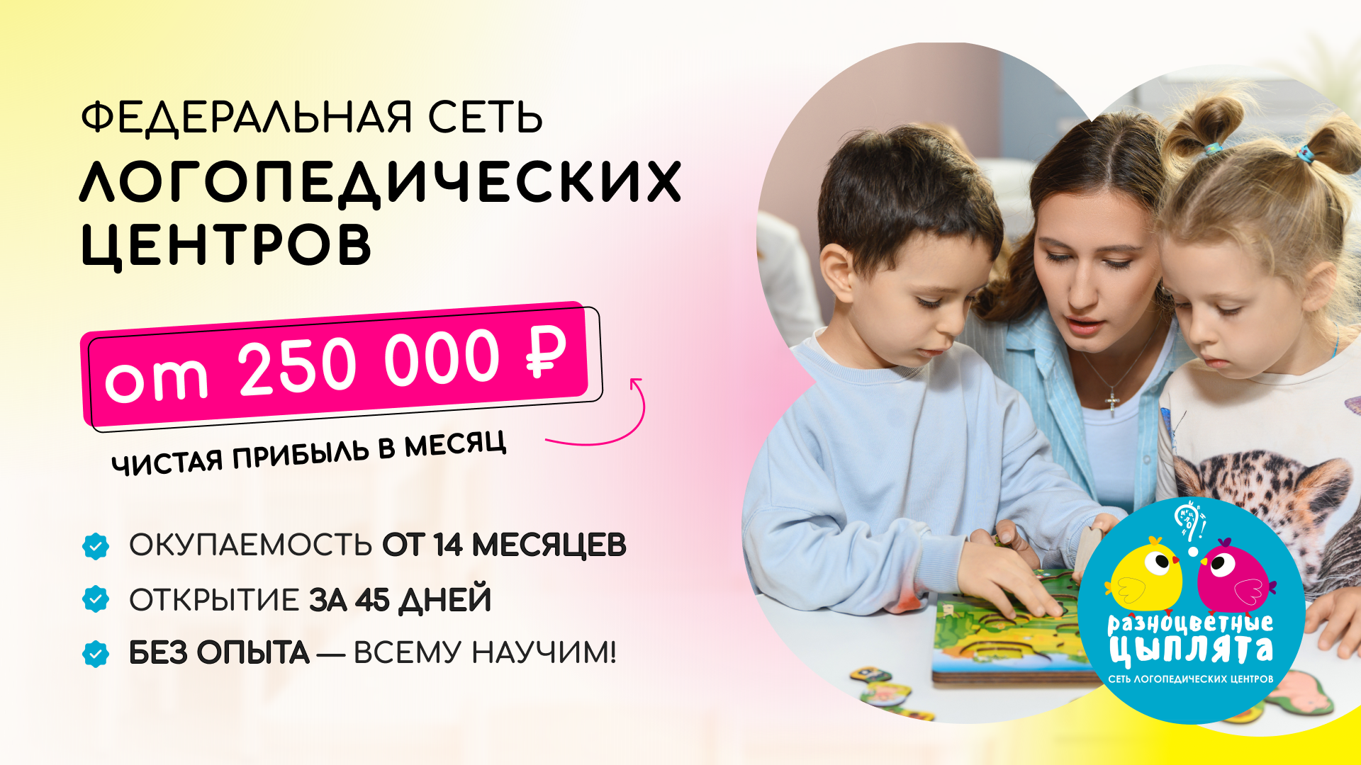 Сеть логопедических центров №1 с 2015 года с 111+ открытыми центрами. Мы включены в ТОП-10 франшиз по версии Forbes. Спрос на коррекцию речи растёт на 30% ежегодно, конкуренция минимальна, спрос стабильно высокий. Средняя выручка центра — от 1 000 000 рублей в месяц, прибыль — от 250 000 рублей. 92% партнёров вышли на результат даже без опыта. Запуск занимает всего 45 дней. Оставьте заявку и узнайте, как построить бизнес с высоким смыслом и стабильным доходом.