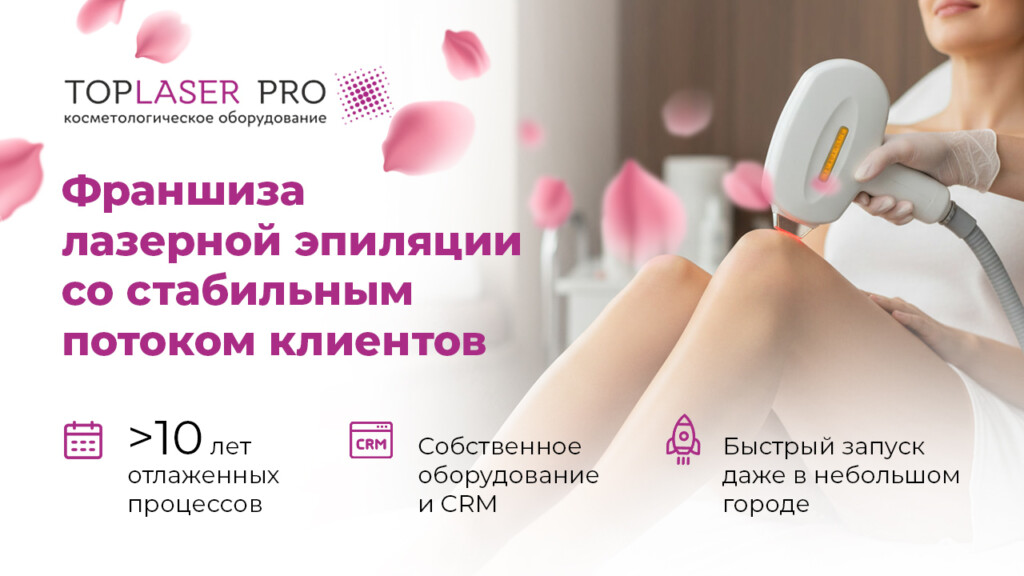 Toplaser.proСтоимость590 000 ₽Инвестиции1 200 000 ₽Окупаемость5 мес.Доход340 000 ₽Мы приглашаем вас присоединиться к команде Toplaser.pro — сети студий лазерной эпиляции, косметологии и коррекции фигуры! С 2014 года мы — лидеры импорта косметологических аппаратов в России. Партнёры получают аренду оборудования, бесплатное сервисное обслуживание и гарантию окупаемости. Наша аккредитованная школа обучает мастеров и EMS-тренеров. Присоединяйтесь к нам и начните свой путь к успеху, предлагая востребованную услугу в сфере красоты! Рынок косметологии, а именно лазерной эпиляции растёт темпом ~17 % ежегодно.