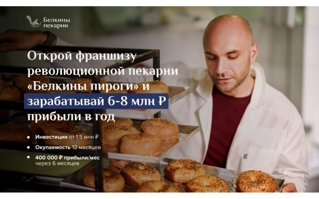 Белкины ПирогиСтоимость690 000 ₽Инвестиции2 000 000 ₽Окупаемость9 мес.Доход1 000 000 ₽Это современная пекарня формата dark kitchen с выручкой 3 000 000 рублей, рентабельностью 27% и чистой прибылью от 600 000 рублей в месяц. Уникальная бизнес-модель включает массовое производство, комплексный маркетинг, высокую маржинальность и адаптивный ассортимент. Подходит для запуска с нуля или на базе действующего заведения. Рынок доставки еды растёт на 30–40% в год, обеспечивая стабильный спрос.