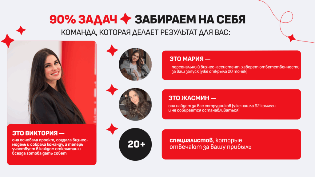 Я — мама троих детей и бывший учитель. Открыла Академию хореографии «Синергия», за полгода вышла на выручку 760 000 ₽ у уже окупилась. В первый месяц продала десятки годовых абонементов, сейчас у нас 100+ учеников и 14 групп. Маркетинг и подбор педагогов организовала лично собственница бренда Виктория Харитонова. Менеджеры помогали открывать точку “как свою”. Теперь хочется все время находиться в академии и помогать детям