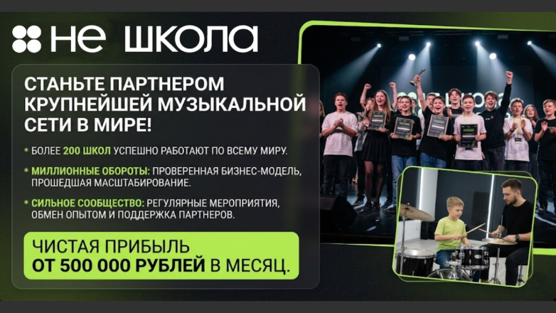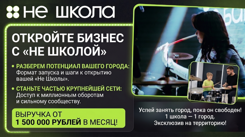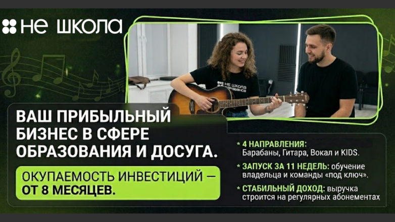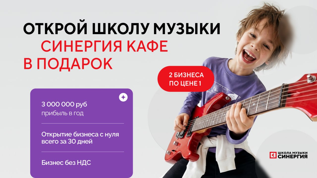 Школа музыки «Синергия»Стоимость750 000 ₽Инвестиции850 000 ₽Окупаемость8 мес.Доход300 000 ₽Наша академия является уникальным детским проектом холдинга СИНЕРГИЯ. Мы обеспечим вас первыми 20 учениками до открытия, передадим оцифрованные бизнес-процессы и простую схему управления, доступную даже новичкам в бизнесе. Мы гарантируем вам прибыль с первого месяца и рентабельность 43–60%. А благодаря команде маркетологов и поддержке на всех этапах запуска, мы сделаем запуск вашего бизнеса максимально лёгким и комфортным.