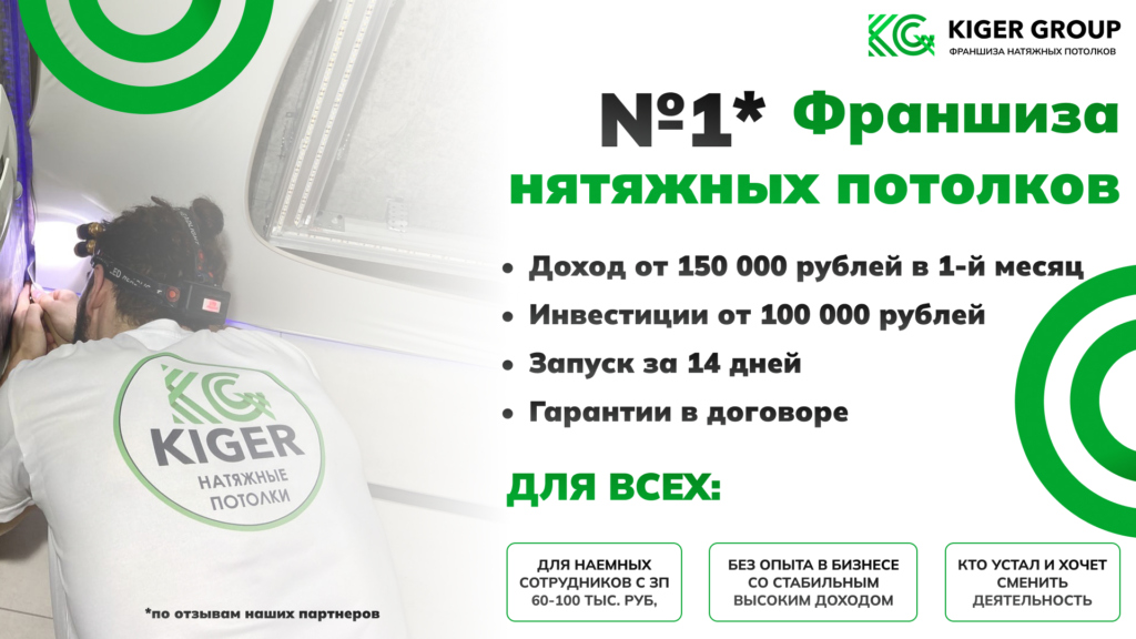 KIGERСтоимость500 000 ₽Инвестиции100 000 ₽Окупаемость2 мес.Доход700 000 ₽Запустив бизнес, вы будете зарабатывать до 700 000 рублей ежемесячно с маржой до 40%, устанавливая натяжные потолки. Гарантия прибыли прописана в договоре, а полное обучение и поддержка обеспечивают старт даже новичкам. В условиях роста строительного рынка наша специализированная ниша характеризуется высоким спросом и низкой конкуренцией, что создает благоприятные условия для вашего профессионального развития и финансового успеха