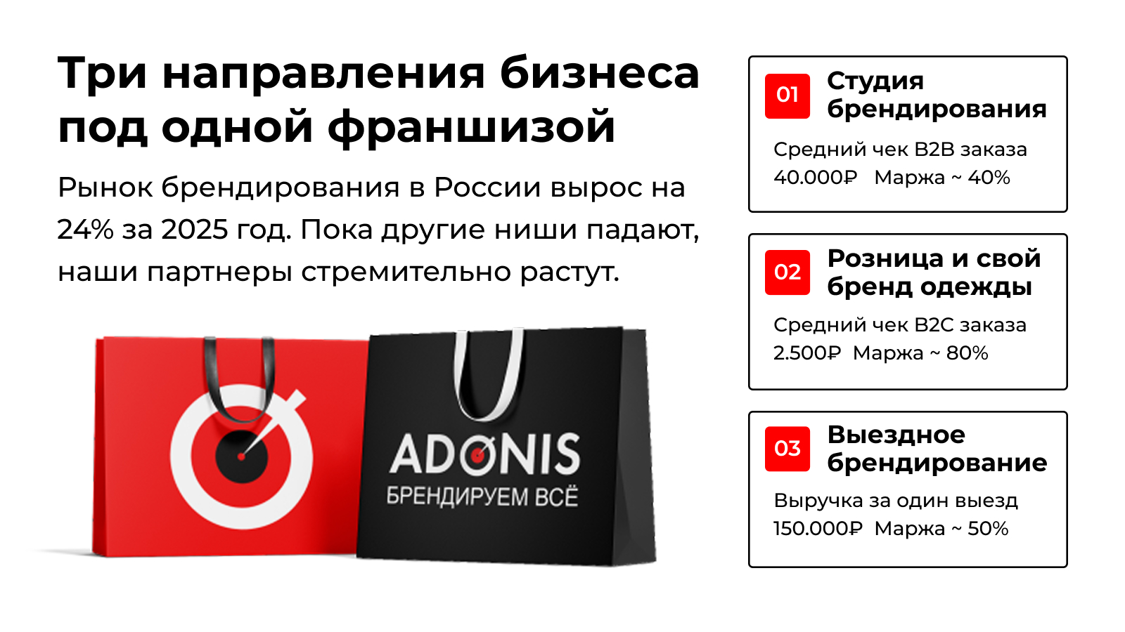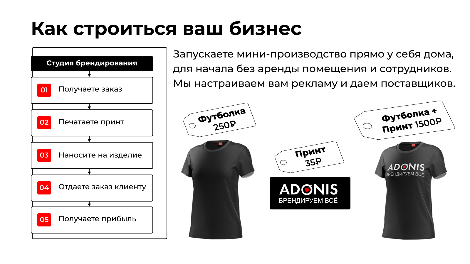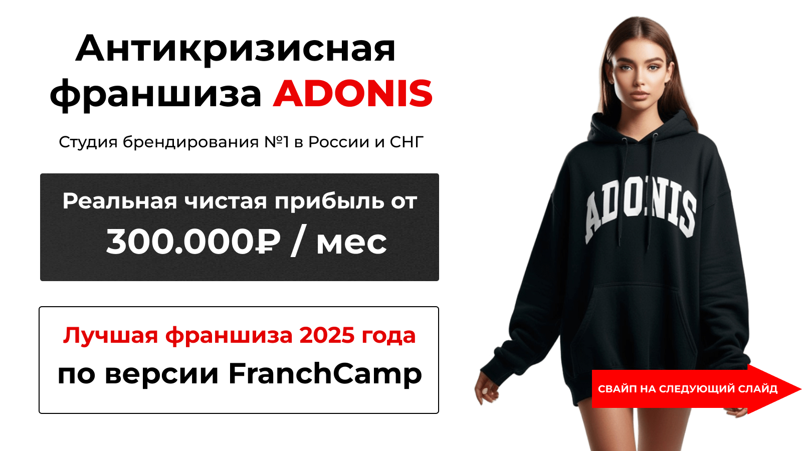AdonisСтоимость300 000 ₽Инвестиции500 000 ₽Окупаемость3 мес.Доход300 000 ₽Откройте бизнес по производству брендированной продукции: работайте с оптом и розницей. Гарантируем первые заказы за 14 дней по уникальной системе! Вы получаете всё необходимое для старта: оборудование, обучение, настройку рекламы и помощь в продажах. Средняя прибыль в первый месяц 100 000 рублей. Далее 300к и больше. Бизнес подойдет как опытным предпринимателям, так и новичкам. Прибыль некоторых партнеров до 1 млн в месяц. Бизнес хорошо работает в кризис и окупается за 3-4 месяца. Все наши 80 точек работают в плюс, а партнеры помогают друг другу.