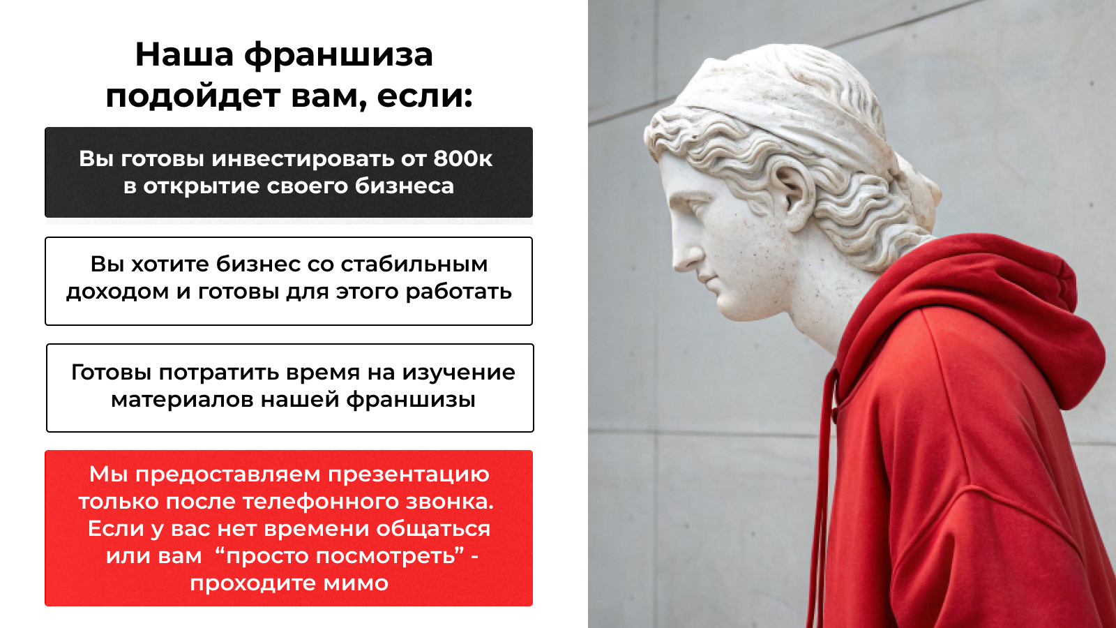 Чистый ЛистСтоимость600 000 ₽Инвестиции150 000 ₽Окупаемость3 мес.Доход700 000 ₽Франшиза юридической компании по списанию долгов с гарантией окупаемости по договору. Компания работает с 2014 года, помогла 20 000 клиентам и развила сеть из 50+ партнёров по всей России (по запросу предоставим контакты партнёров). Наши партнёры зарабатывают до 700 000 рублей в месяц. Вы открываете офис для консультаций, а всю юридическую ответственность берёт на себя головной офис. Опыт и юробразование не требуются. Гарантия снижает риски и обеспечивает безопасный старт. Начните бизнес без увольнения с работы.
