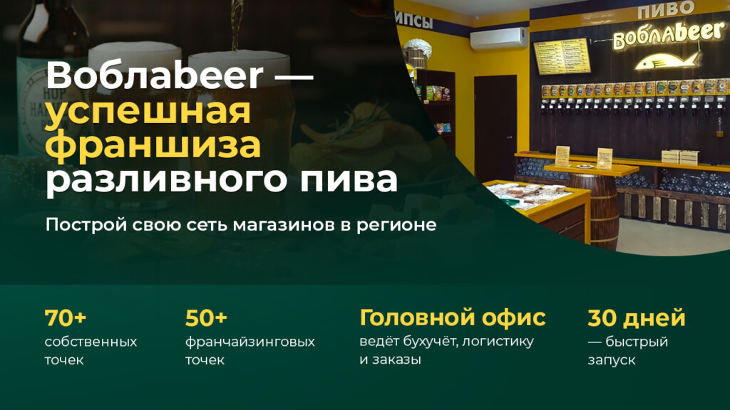 ВоблаbeerСтоимость490 000 ₽Инвестиции1 000 000 ₽Окупаемость4 мес.Доход250 000 ₽Воблаbeer — сети магазинов разливных напитков с 10-ти летней историей и чистой прибылью от 3 000 000 рублей в год. Открыто 70+ собственных магазинов и 50+ франшизных, а 60 % прибыли формируется за счёт собственных сортов пива и снеков. Мы даём подробный план запуска, поддержку и проверенную модель, направление востребовано: рынок крафтового пива растёт на 9% в год.