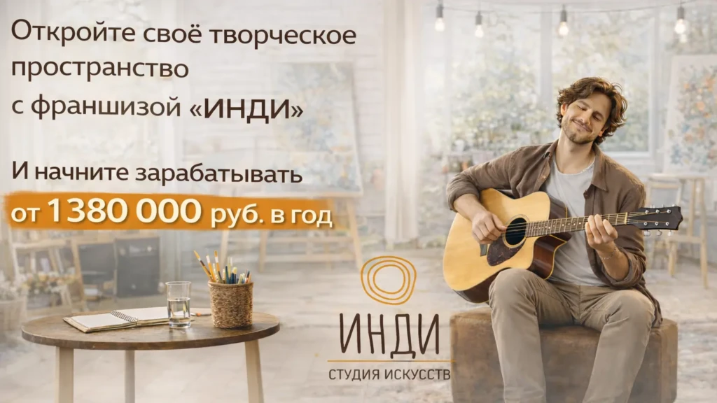 ИНДИСтоимость360 000 ₽Инвестиции258 000 ₽Окупаемость12 мес.Доход115 000 ₽Франшиза «ИНДИ» — уникальная возможность открыть творческое пространство для обучения музыке и живописи. Мы создаем уютную атмосферу, где каждый может раскрыть свою индивидуальность без страха осуждения. Предлагаем дистанционное и очное обучение, поддержку в развитии бизнеса, консультации и рекомендации. Время проявить себя и реализовать творческий потенциал! Реализуйте творческий потенциал и станьте частью вдохновляющей франшизы!