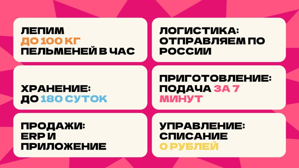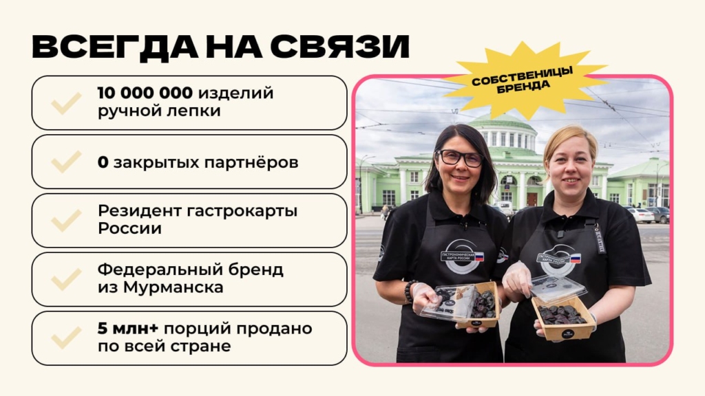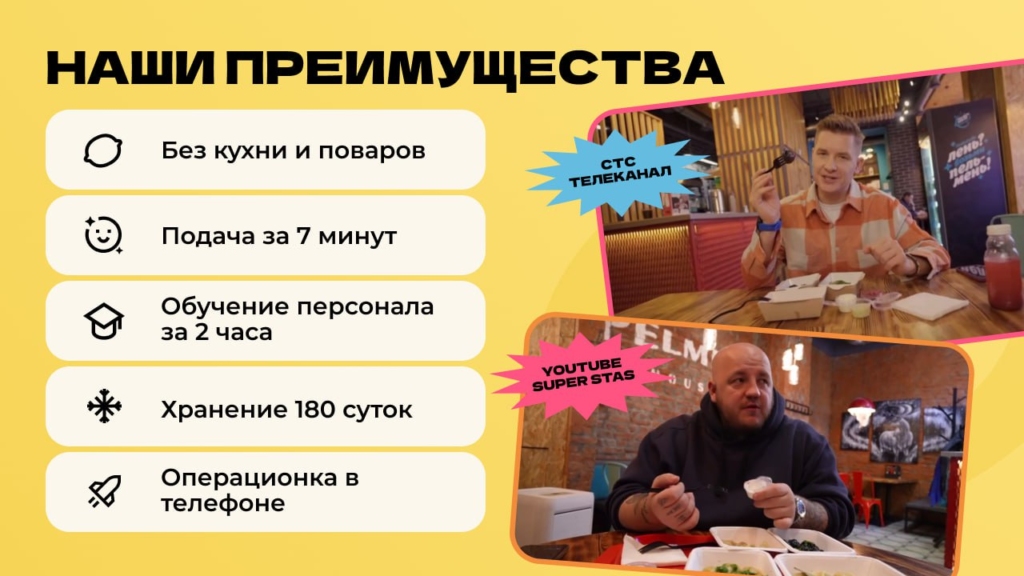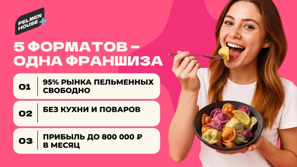 Pelmen houseСтоимость490 000 ₽Инвестиции800 000 ₽Окупаемость8 мес.Доход1 800 000 ₽95% рынка пельменных в России свободны. Pelmen House — франшиза №1: запуск за 4 недели, прибыль до 800 000 ₽ в месяц. Российский стрит-фуд: тонкое тесто, мясо, ручная лепка, авторские начинки. Без поваров, без кухни — 90% меню заморозка, хранится 180 суток, подача за 7 минут. Обучение персонала 2 часа. Pelmen House — победитель Гастрокарты России 2 года подряд. 5 форматов — киоск, фудтрак, фудкорт, кафе или вендинг 24/7. Пельмени в ТОП-3 блюд страны, а пельменных практически нет. Забирай свой город первым!