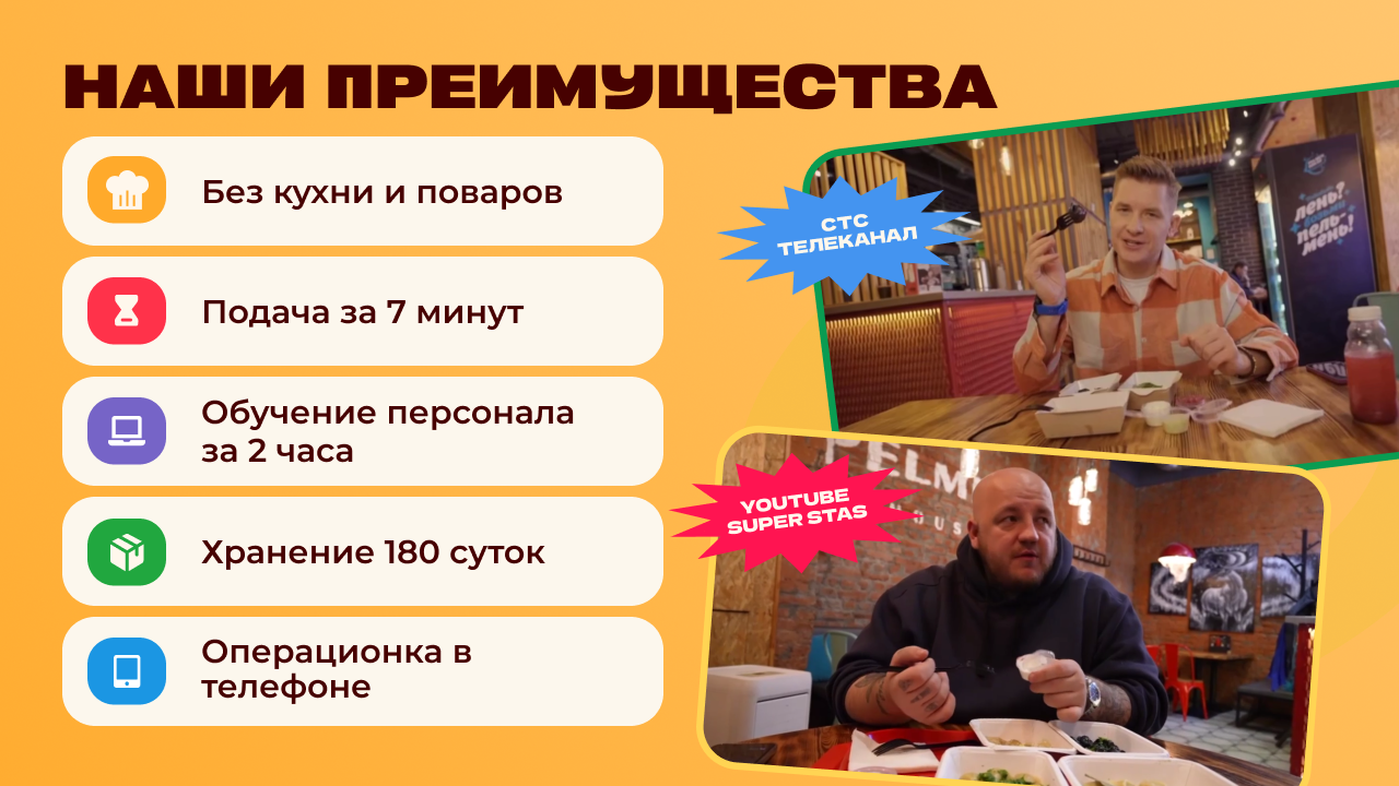 ReFreshСтоимость650 000 ₽Инвестиции70 000 ₽Окупаемость4 мес.Доход1 000 000 ₽Партнёры, выбравшие франшизу, получают доступ к быстрорастущему рынку быстрого питания. В нашей сети 48 микромаркетов самообслуживания с готовой едой и напитками. Наше сотрудничество с крупными брендами, такими как Яндекс, ВкусВилл и Сбербанк, обеспечивает высокую узнаваемость. Для старта предоставляется все необходимое оборудование, а запуск занимает всего 15 дней. Рынок микромаркетов растет на 12% ежегодно, благодаря спросу на удобные решения в местах высокой проходимости.