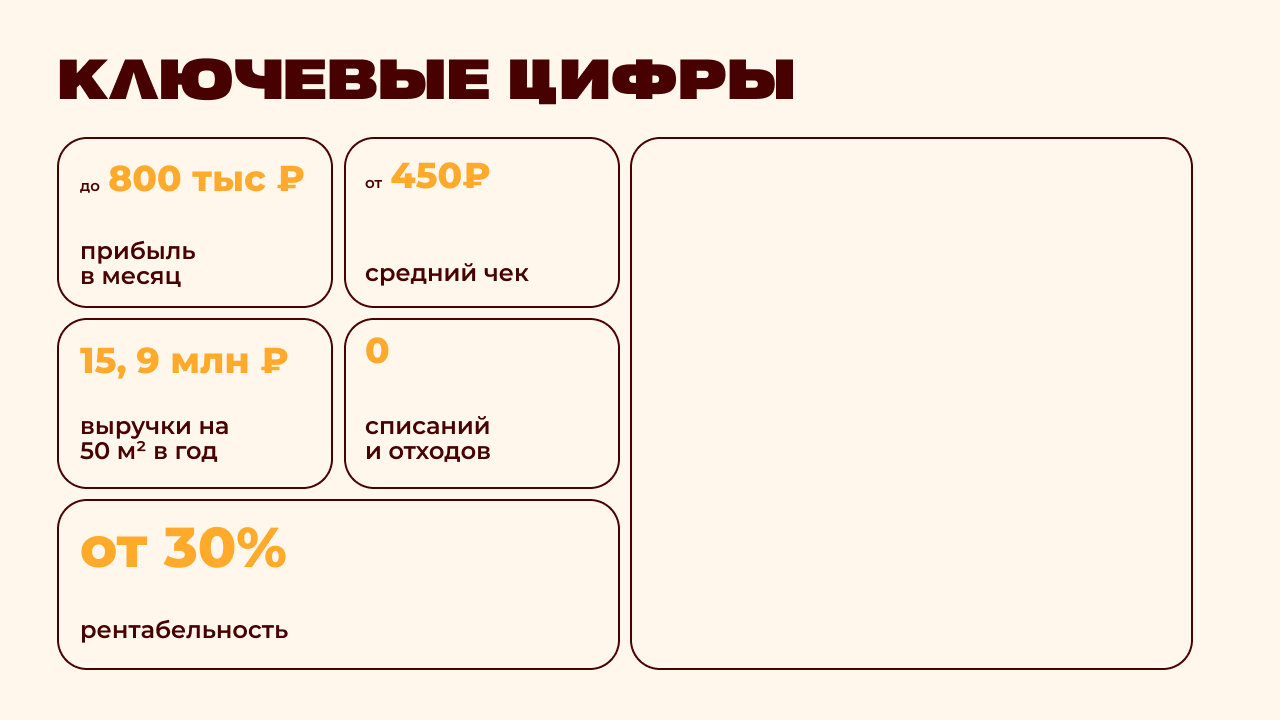 Coffee RussСтоимость360 000 ₽Инвестиции1 500 000 ₽Окупаемость9 мес.Доход200 000 ₽Это не ещё одна кофейня, чьё название невозможно запомнить. Мы — сеть Коферусс с национальным характером и яркой идентичностью. Наши партнеры добиваются окупаемости за срок 6-10 месяцев. Мы всему вас обучим, поможем с подбором помещения, открытием кофейни, наймом сотрудников и будем рядом на каждом этапе. Наши партнёры уже управляют успешными точками по всей Москве. Мы знаем, как не потеряться на карте города, и верим, что у кофе — большое русское будущее. Присоединяйтесь к нашей истории!
