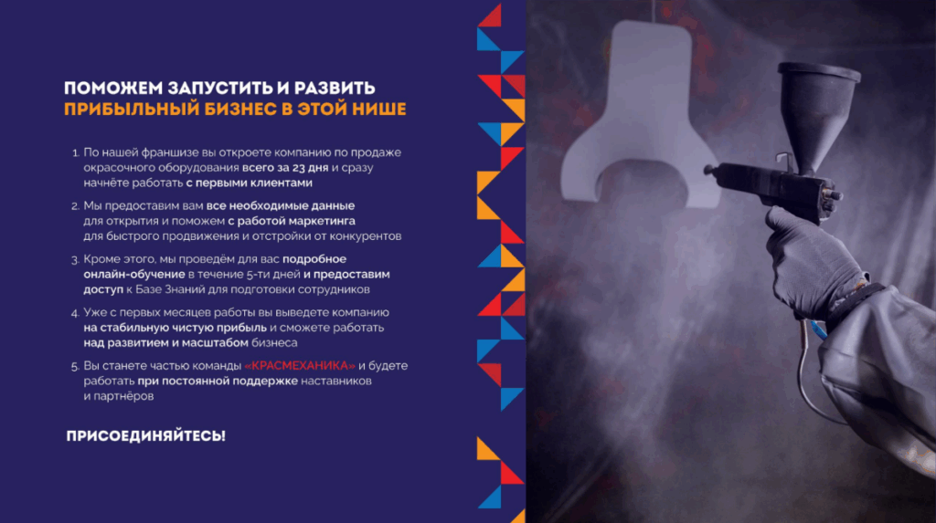 КрасмеханикаСтоимость360 000 ₽Инвестиции1 018 000 ₽Окупаемость6 мес.Доход350 000 ₽Магазин-шоурум и онлайн-платформа с широким ассортиментом оборудования и комплектующих. Бизнес в динамично развивающейся нише промышленного оборудования с высоким спросом. Мы сопровождаем партнёра на всех этапах: от выбора техники до сервисного обслуживания. Более 2 500 товаров, постоянные поставки и полная поддержка. Рынок автоматизации растёт — откройте стабильный бизнес с надёжным брендом.