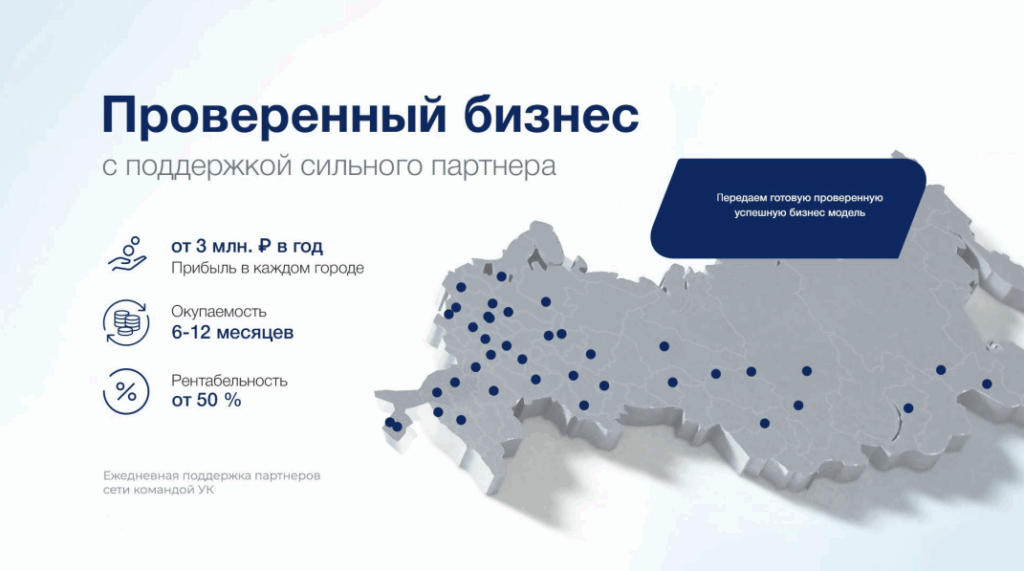 PodospecificСтоимость670 000 ₽Инвестиции1 000 000 ₽Окупаемость6 мес.Доход350 000 ₽Мы — сеть центров подологии с высоким спросом и низкой конкуренцией. Вы будете получать доход до 350 000 рублей в месяц благодаря востребованным услугам и отсутствию крупных сетевых игроков. Полное сопровождение включает обучение, инструкции, помощь в подборе помещения, найме сотрудников и маркетинге. Рынок подологии активно растёт, обеспечивая быструю окупаемость и стабильный поток клиентов! По оценкам маркетинговых агентств, за последние 3 года количество запросов в Яндексе увеличилось на 40%.