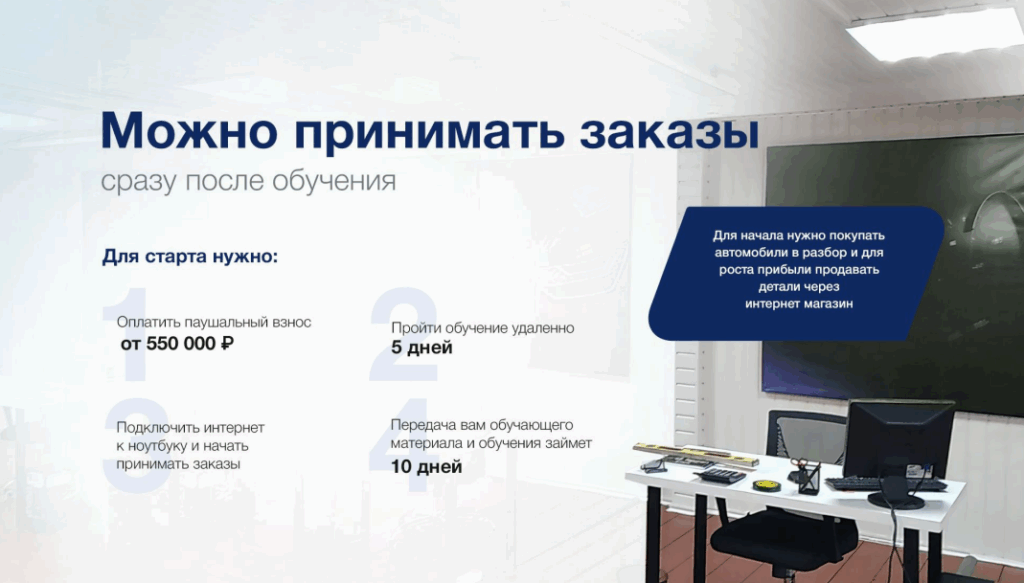 Детальный подходСтоимость490 000 ₽Инвестиции800 000 ₽Окупаемость5 мес.Доход600 000 ₽Проверенная бизнес-модель в нише продажи б/у автозапчастей. Маржинальность до 1000% с чистой прибылью от 200 000 руб. в месяц с одного машино-комплекта. Партнёрам доступны: надёжные поставщики, автоматизированная бизнес-модель, поставка комплектов из Англии, ОАЭ, США и СНГ, готовый интернет-магазин и полная поддержка на всех этапах запуска и ведения бизнеса. Это возможность войти в высокодоходную и стабильную нишу с минимальными рисками.