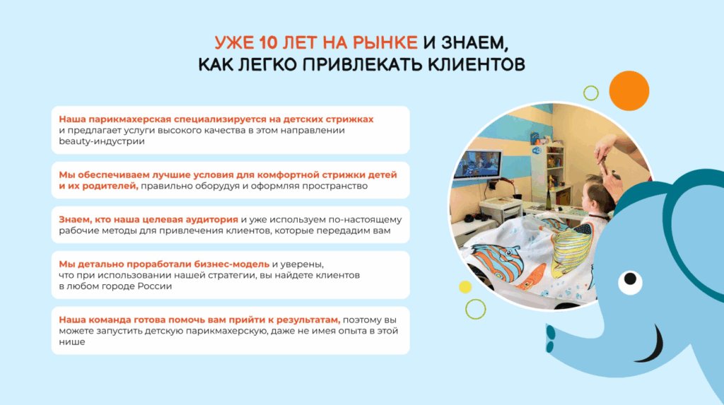 Мир НепоседСтоимость350 000 ₽Инвестиции1 341 000 ₽Окупаемость15 мес.Доход110 000 ₽Франшиза детской парикмахерской — это проверенная модель с 10-летним опытом. Яркий интерьер, игровые зоны и маленькие подарки создают атмосферу праздника. Средний чек - 1000 руб., рентабельность бизнеса от 28%. Вы получите готовую концепцию, опытных наставников, поддержку на каждом этапе и сможете зарабатывать от 1 300 000 руб. чистой прибыли в год, развивая узнаваемый бренд в растущей нише.
