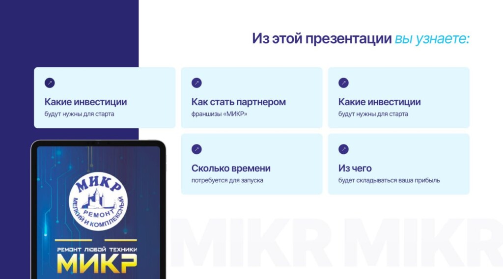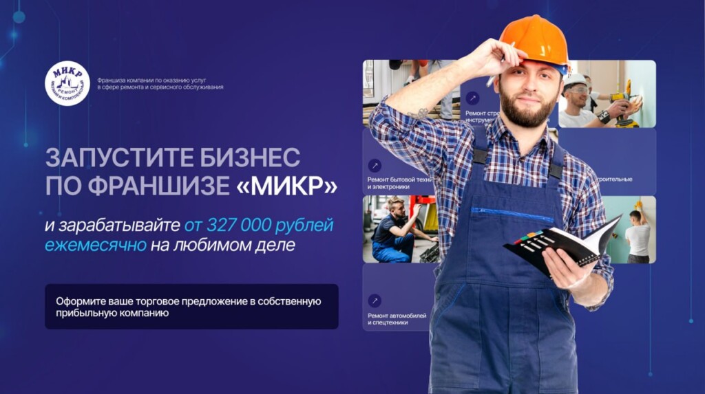 МИКРСтоимость360 000 ₽Инвестиции1 015 000 ₽Окупаемость9 мес.Доход320 000 ₽Многофункциональная франшиза сервисных услуг с окупаемостью 9 месяцев. За более 20 лет на рынке, нами было выполнено 100 000+ заказов. Один бренд — десятки направлений: ремонт техники, автосервисы, строительные и юридические услуги, салонные услуги и многое другое. Вы сами формируете набор услуг под спрос своего региона. Помогаем с CRM, персоналом, стратегией роста и маркетингом. Стремитесь развиваться? Присоединяйтесь к МИКР — создайте свой успешный бизнес вместе с нами!