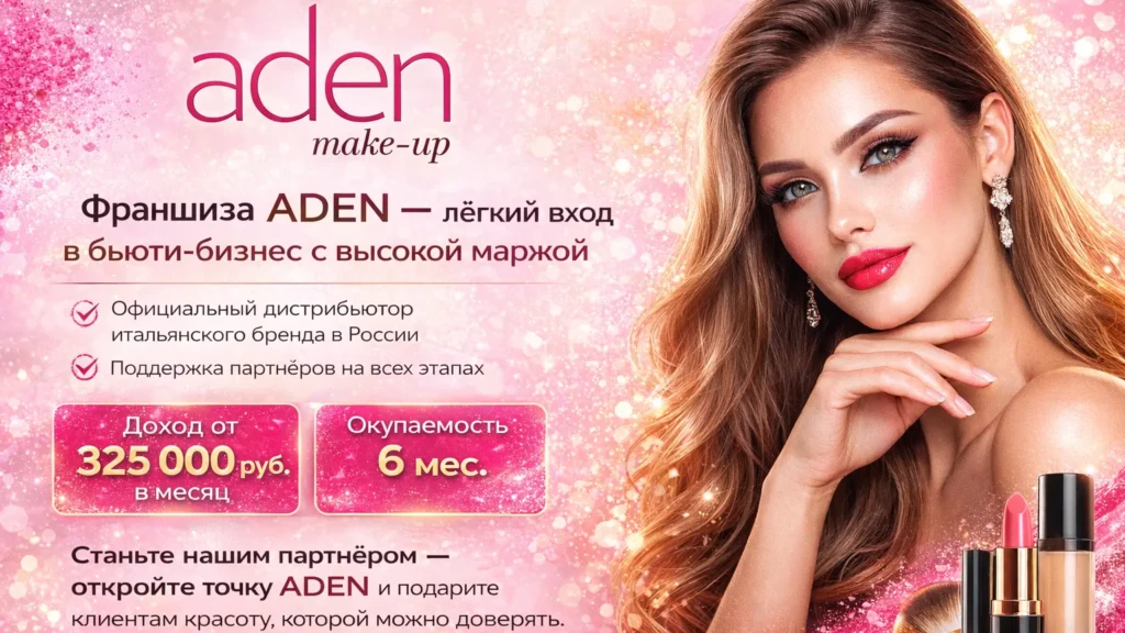 ADENСтоимость360 000 ₽Инвестиции625 500 ₽Окупаемость6 мес.Доход325 000 ₽Франшиза ADEN — лёгкий вход в бьюти-бизнес с высокой маржой. Мы — официальный дистрибьютор итальянского бренда ADEN в России. Мы предлагаем эксклюзивные продукты с безупречной репутацией: соответствуют стандарту HALAL, веган-формуле, гипоаллергенны и не тестируются на животных. Наши партнёры зарабатывают от 325 000 рублей в месяц. Вы получаете федеральную рекламу, участие в выставках и конференциях, а также поддержку на всех этапах. Станьте нашим партнёром — откройте точку ADEN и подарите клиентам красоту, которой можно доверять.