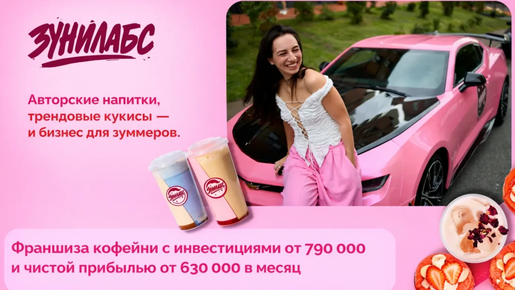 ЗунилабсСтоимость790 000 ₽Инвестиции350 000 ₽Окупаемость3 мес.Доход630 000 ₽Кофейня ЗУНИЛАБС — уютное место, которое привлекает гостей, особенно зумеров, своими фирменными двойными напитками — дабблами, знакомыми всему городу, и необычными печеньями — кукисами. Формат выстроен так, чтобы партнёр с первого дня видел, как растёт его прибыль. Доход — от 630 000 руб. в месяц. Бренд, стандарты, рецептуры и поддержка уже готовы. Вам остаётся открыть двери и встретить гостей!