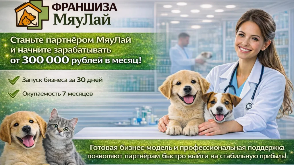 МяуЛайСтоимость300 000 ₽Инвестиции1 000 000 ₽Окупаемость7 мес.Доход300 000 ₽Станьте частью истории МяуЛай и зарабатывайте от 300 000 рублей ежемесячно на ветеринарных услугах! Нашим партнерам мы поможем запустить бизнес за 30 дней, проведем обучение для всей команды, поможем с поиском помещения, обеспечим клиентами, благодаря грамотно построенной рекламной кампании и дадим поставщиков оборудования. Наши клиники предоставляют лечение, стационар, гостиницу для питомцев, груминг и другие услуги. Готовая бизнес-модель и профессиональная поддержка позволяют партнёрам быстро выйти на стабильную прибыль.