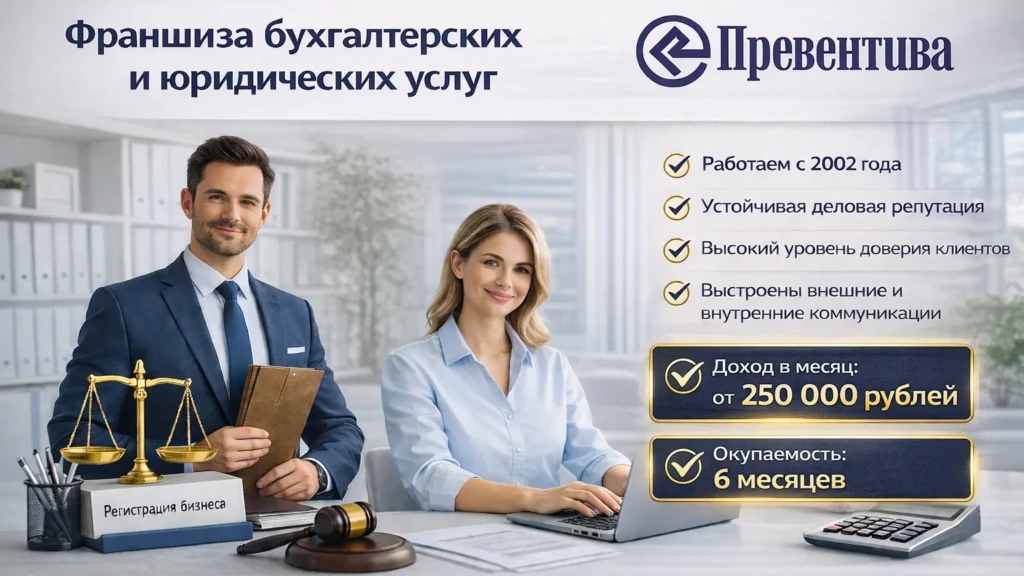 ПревентиваСтоимость580 000 ₽Инвестиции900 000 ₽Окупаемость6 мес.Доход250 000 ₽Франшиза «Превентива» — это готовый бизнес-конструктор в сфере бухгалтерских и юридических услуг с гарантиями перед клиентами и партнерами. Принцип «Единого окна» — ваше ключевое конкурентные преимущество. Клиент получает ВСЁ в одном месте: от регистрации бизнеса до сложных судебных споров, от расчета зарплаты до кадрового делопроизводства. Вы становитесь для него единственным и незаменимым партнером.