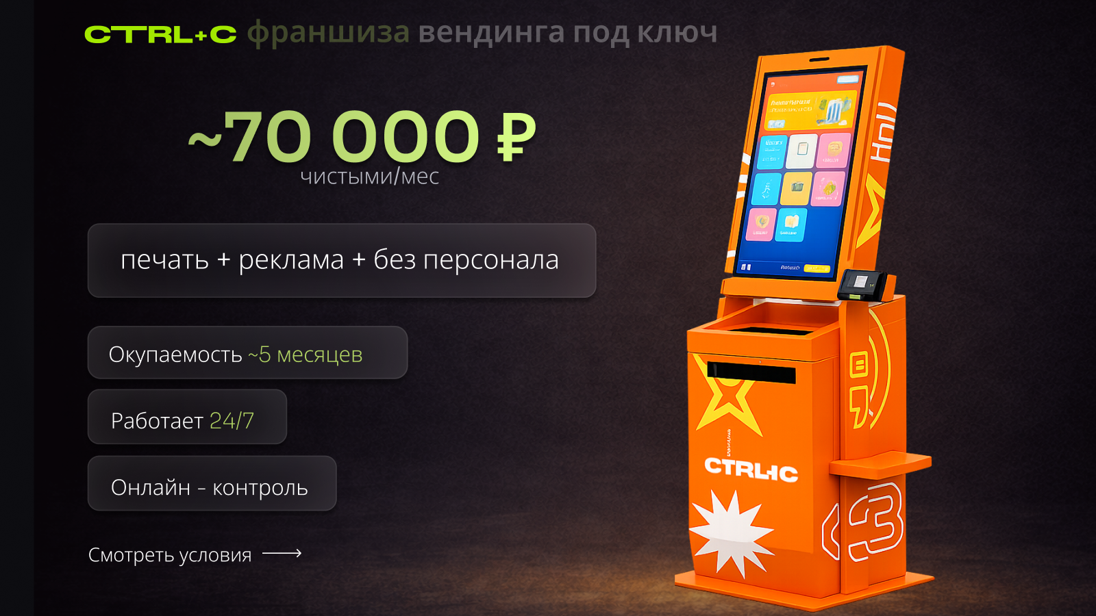 Папа, ну купи!Стоимость200 000 ₽Инвестиции500 000 ₽Окупаемость5 мес.Доход300 000 ₽Папа, ну купи! — франшиза с гарантированным доходом. Покупай 3 аппарата по цене 2 и зарабатывай от 300 000 руб. в месяц, продавая всего три игрушки в день. Выберите место с большим потоком детей и родителей — весь маркетинг мы берём на себя: от выбора самых популярных игрушек до стратегии продвижения вашего бизнеса. Простая модель, быстрый старт и стабильный доход!