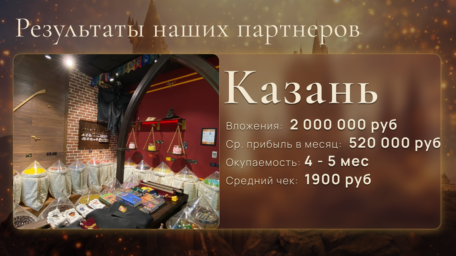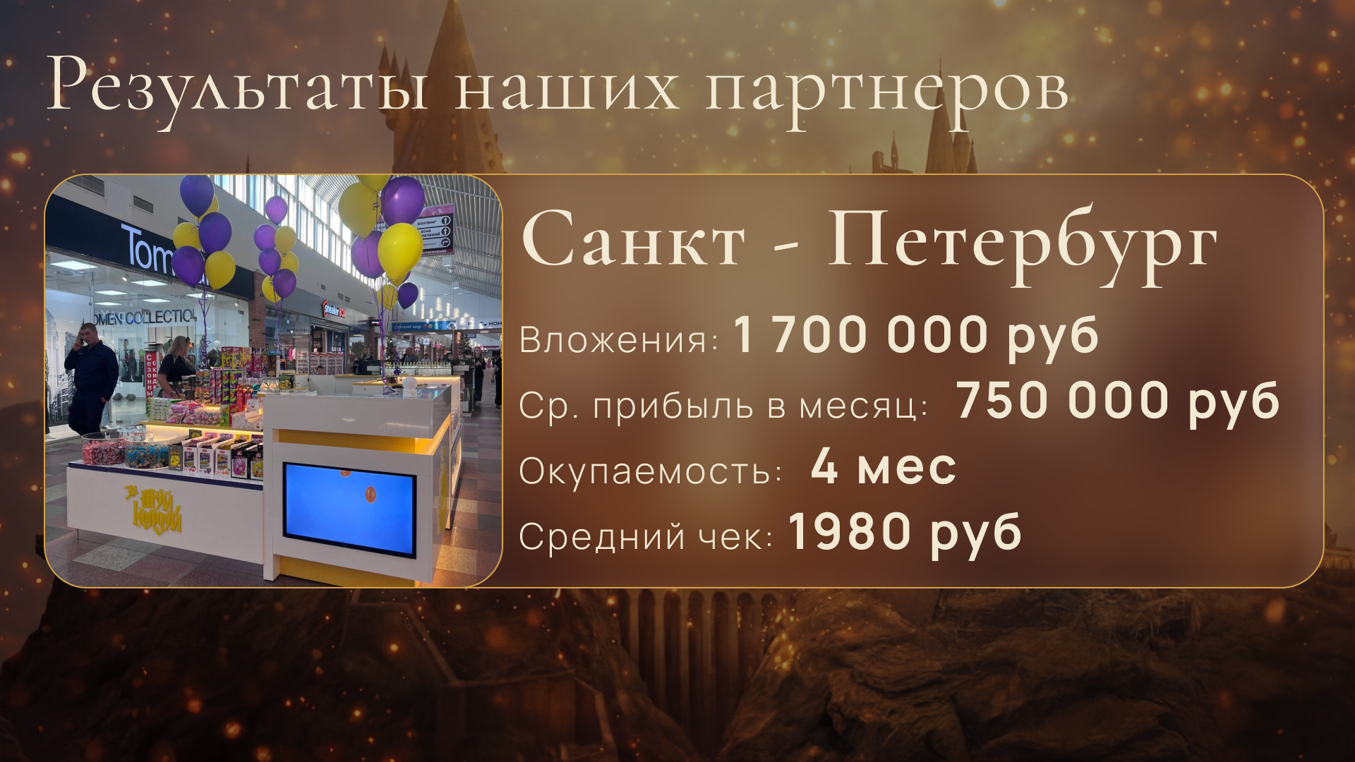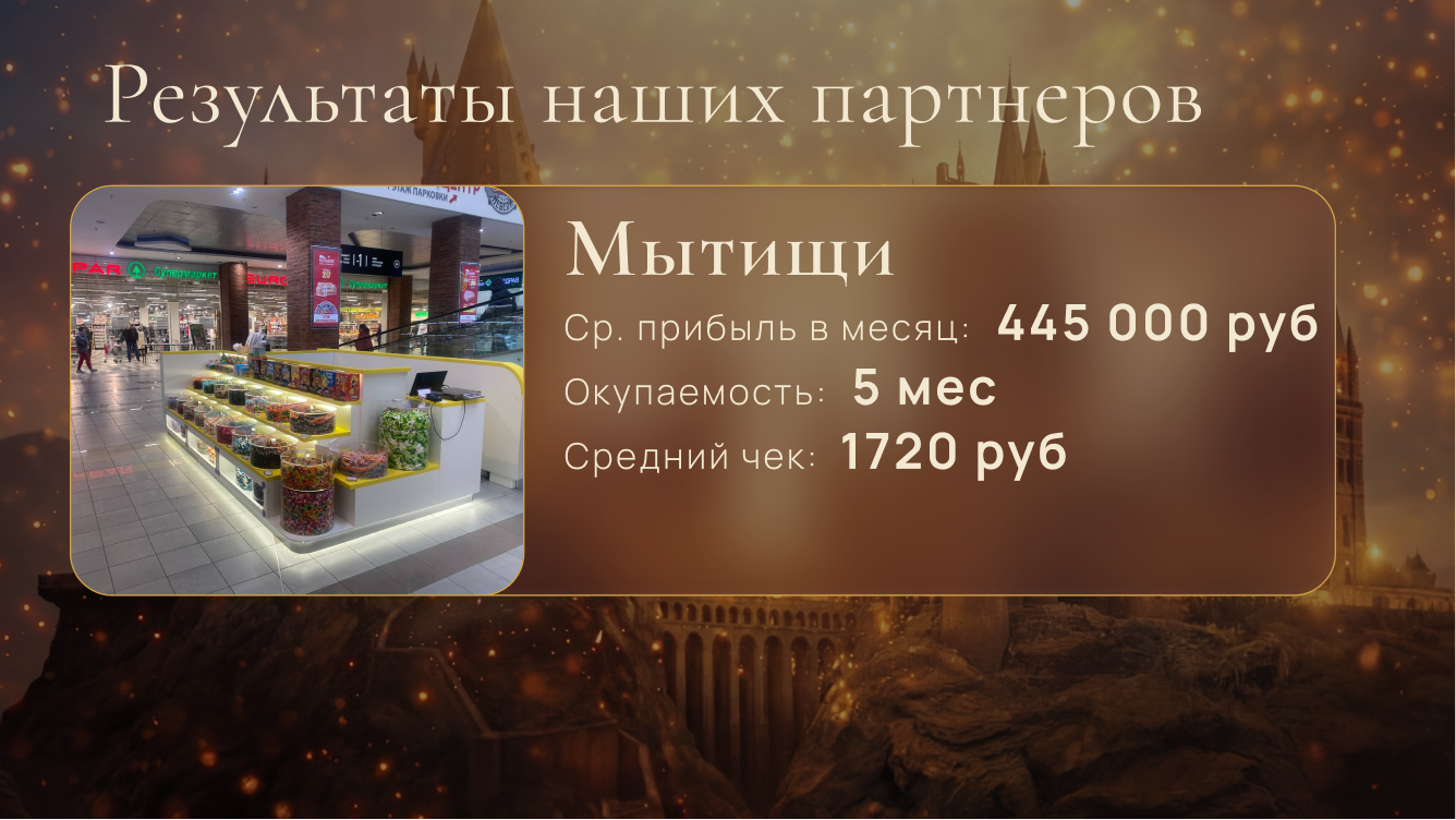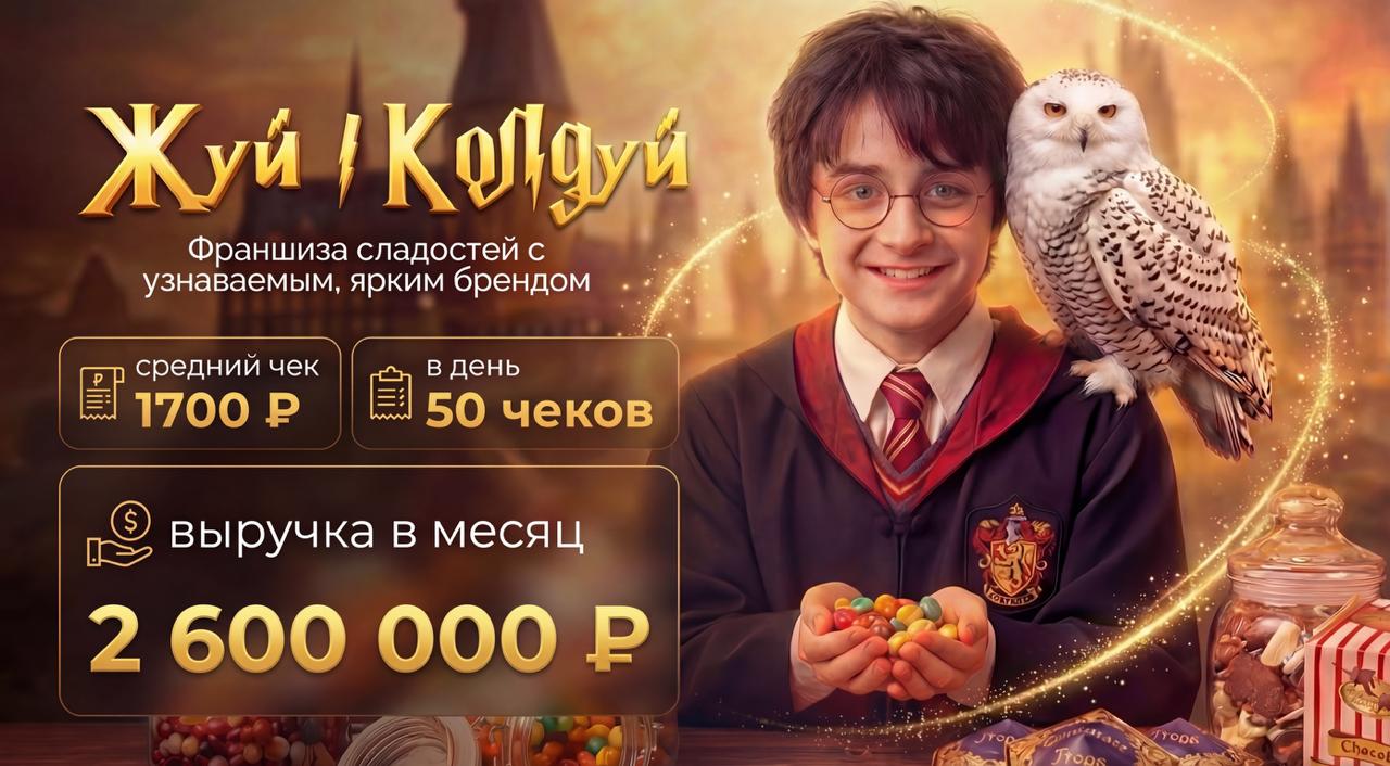 Жуй - КолдуйСтоимость490 000 ₽Инвестиции0 ₽Окупаемость4 мес.Доход280 000 ₽Открой «Жуй Колдуй» — яркий магазин сладостей с атмосферой Harry Potter и зарабатывай от 700 000 рублей чистыми в месяц. Наши точки притягивают покупателей сами: основа дохода — яркие сладости на развес и тематические товары, которые усиливают средний чек, маржинальность более 200%. Каждого партнёра мы запускаем с нуля, даём готовую модель, обучаем всем процессам и сопровождаем до стабильной прибыли. Присоединяйся!