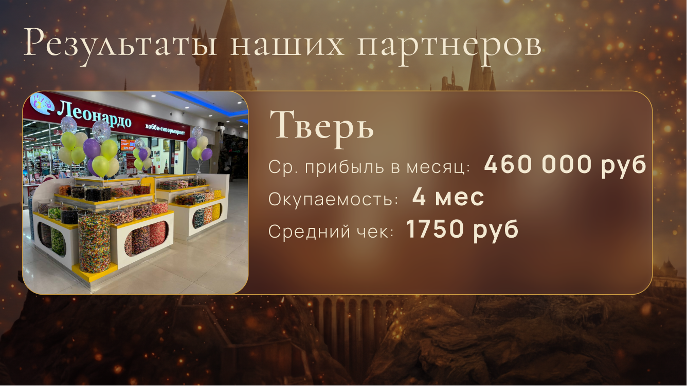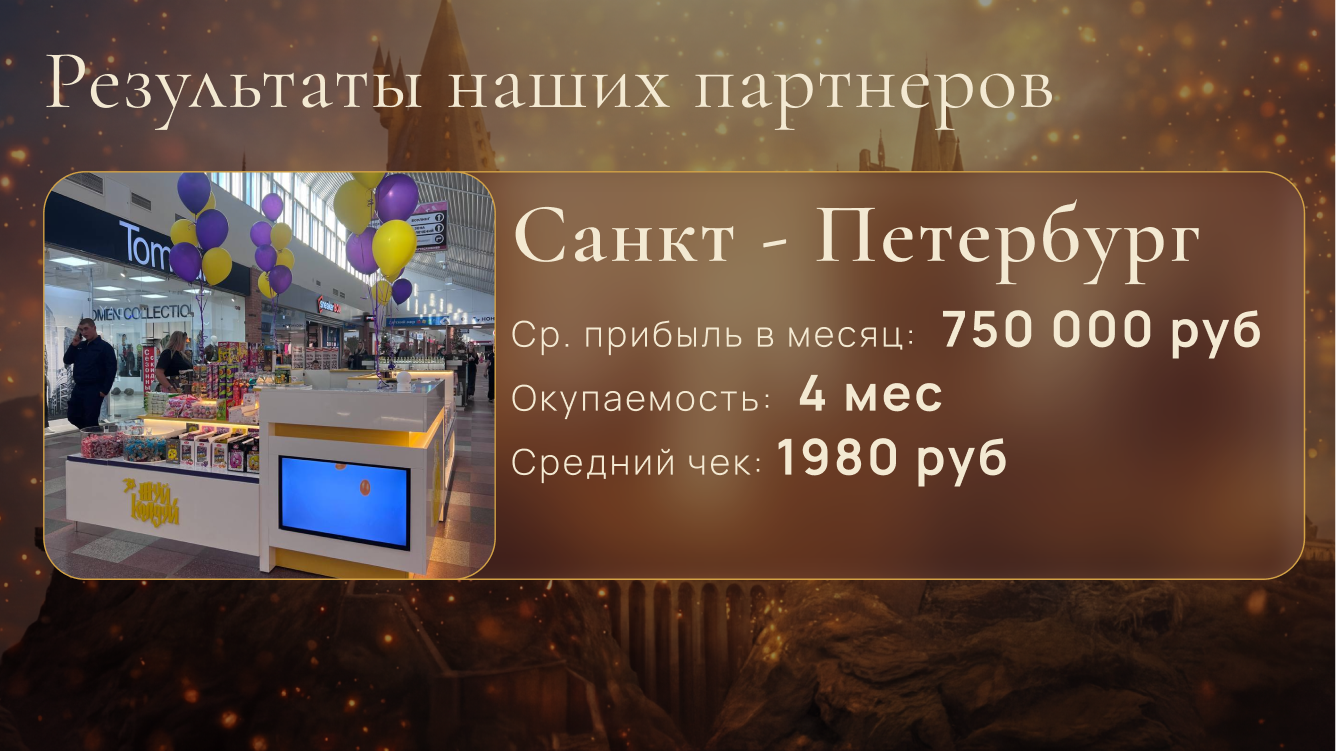 Жуй - КолдуйСтоимость490 000 ₽Инвестиции0 ₽Окупаемость4 мес.Доход280 000 ₽Запусти «Жуй Колдуй» и зарабатывай от 280 000 ₽ чистыми в месяц на сладостях с наценкой свыше 200%. Средний чек от 1 700 ₽, окупаемость от 3 месяцев. Атмосфера Harry Potter, яркий ассортимент и тематическая атрибутика создают высокий спрос и сильный средний чек. Мы полностью запускаем бизнес под ключ и сопровождаем до стабильной прибыли.