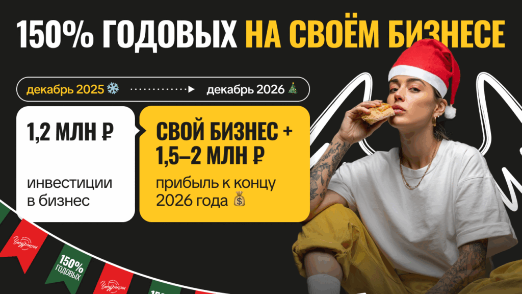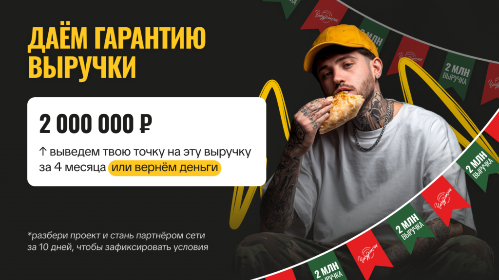 ЧебуссэрСтоимость360 000 ₽Инвестиции1 500 000 ₽Окупаемость5 мес.Доход100 000 ₽«Чебуссэр» — стритфуд нового поколения. Мы устали от однообразной шаурмы и создали честную альтернативу — чебуреки из натуральных продуктов, приготовленные на глазах у гостя. Бизнес с оборотом от 400 000 руб. в месяц. Уникальное тесто, 12 авторских начинок и отточенная технология. Готовая бизнес-модель, пошаговое обучение, поддержка команды, доступ в закрытое сообщество и помощь на всех этапах запуска и ведения бизнеса. Франшиза для тех, кто хочет вкусно кормить людей и открыть бизнес с душой. Показать больше