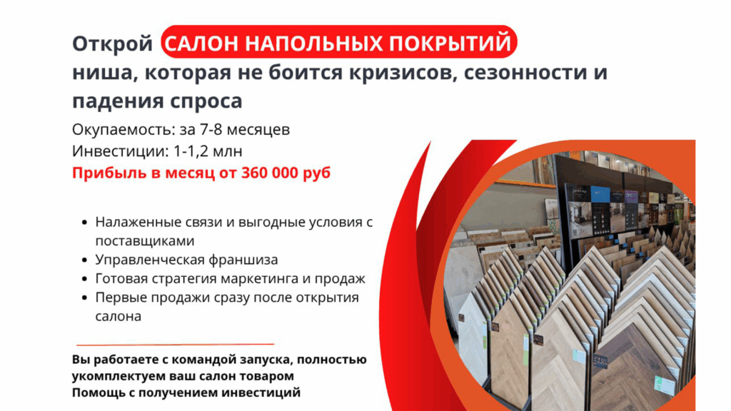 Открыл салон по франшизе напольных покрытий без лишней бюрократии, без “воды”, сразу к деньгам. Уже в первые месяцы проект вышел в прибыль. Всё готово: реклама, CRM, обучение, поставщики. Управляющая компания реально включается в процесс, а не “передаёт бренд и исчезает”. Здесь не надо гадать, что делать просто повторяешь пошаговую систему и зарабатываешь. Это бизнес, который работает, а не “инвестиция в воздух”.