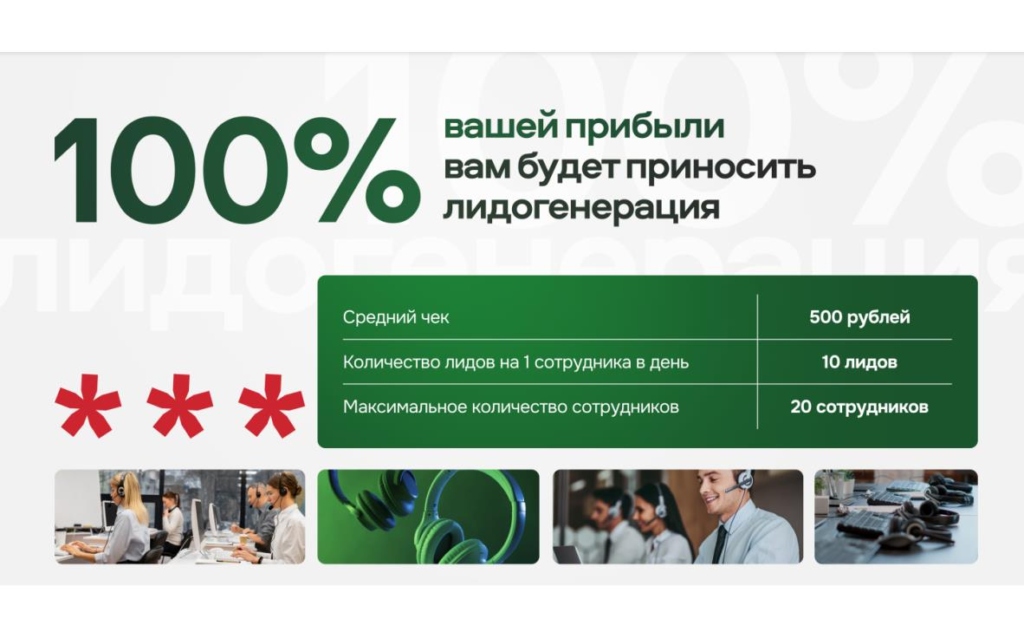 Prostudio ExpertsСтоимость390 000 ₽Инвестиции390 000 ₽Окупаемость3 мес.Доход300 000 ₽Prostudio Experts – агентство интернет-маркетинга с прибылью от 3 600 000 в год и минимальными вложениями. Запустите бизнес за 23 дня и зарабатывайте в любой нише: создавайте и продвигайте сайты, оптимизируйте карточки товаров на маркетплейсах, генерируйте лиды. Мы поможем вам с выбором локации, обучим специалистов, настроим лидогенерацию, обеспечим тендерными заказами и предоставим колл-центр для обработки заявок. Показать больше