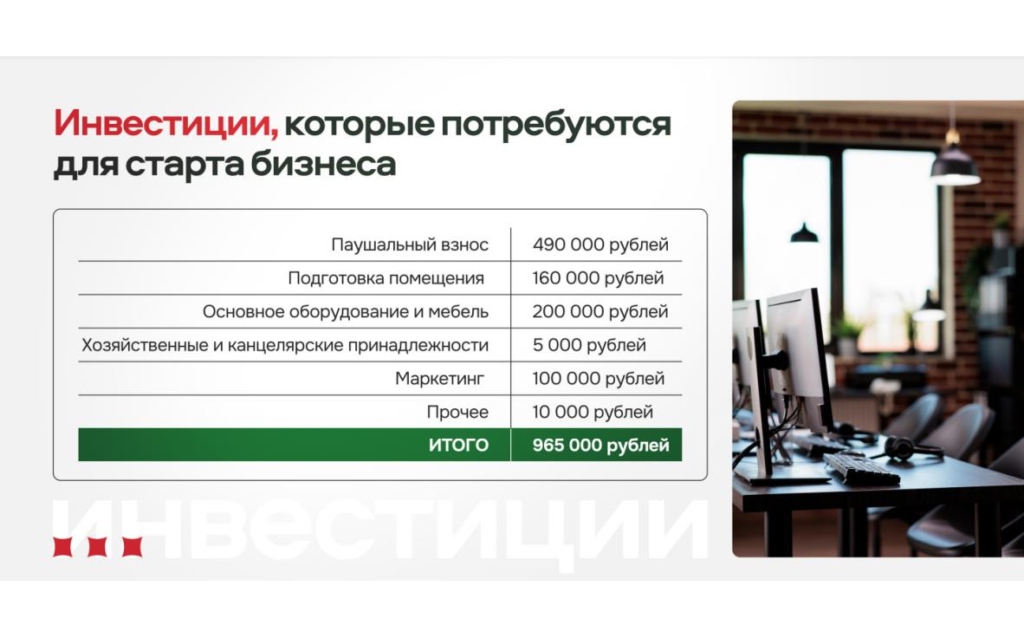 Баскетбольная академия «Зенит»Стоимость475 000 ₽Инвестиции400 000 ₽Окупаемость4 мес.Доход350 000 ₽Откройте детскую баскетбольную академию «Зенит» и станьте частью официальной сети клуба БК «Зенит». Опыт не требуется: каждому партнёру помогает личный куратор и бизнес-трекер. Франшиза предлагает готовую методику, обучение тренеров и полное сопровождение на всех этапах. Старт занимает всего 35 дней, доход постепенно достигает 350 000 рублей в месяц. Инвестиции вы окупите уже через 4 месяца. Бонусы: без % рассрочка до 500 000 рублей, возможность заранее пообщаться с действующими партнёрами. Показать больше