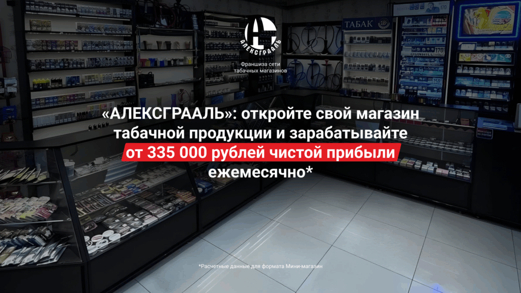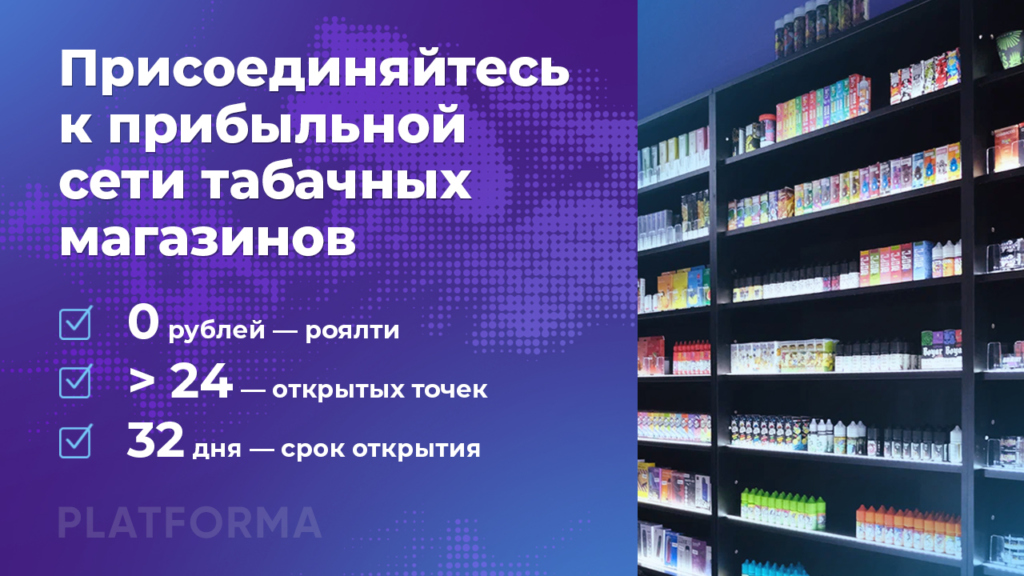 Smoking ShopСтоимость590 000 ₽Инвестиции900 000 ₽Окупаемость6 мес.Доход300 000 ₽Открытие табачного магазина – это возможность войти в стабильный рынок, который продолжает расти. С 2015 года успешно запущено более 1250 точек по России и СНГ. Франчайзи получают до 300 000 рублей ежемесячной прибыли благодаря высокой наценке – до 400%. Предоставляем полный комплект поддержки: от обучающей платформы до помощи в выборе локации, дизайна и поставок. Рынок табачных изделий сохраняет устойчивый рост, и по данным аналитиков, к 2031 году увеличится на 15%. Постройте прибыльный бизнес в перспективной нише с проверенной моделью! Показать больше