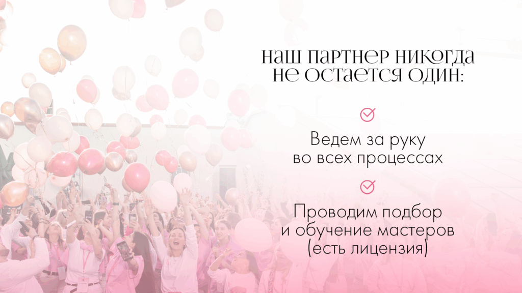 VivatiСтоимость550 000 ₽Инвестиции650 000 ₽Окупаемость15 мес.Доход200 000 ₽Сеть Vivati с 2017 года выросла до 4 собственных и 12 франчайзинговых студий, и этот опыт остаётся актуальным для партнёров сегодня. С нашей поддержкой ваш доход составит от 200 000 руб. Важно: никаких скрытых платежей — нет роялти, коммерческих сборов или обязательных маркетинговых взносов. А поддержка остаётся без сроков от основательницы Виктории, и свобода создания уникального дизайна вашей студии. Актуальность очевидна: индустрия красоты на подъёме, и компактные студии востребованы. Показать больше