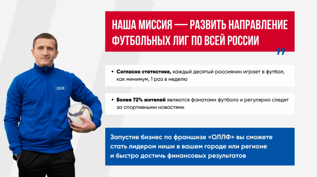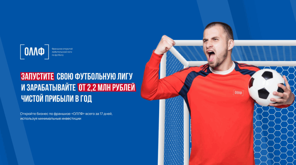 ОЛЛФСтоимость300 000 ₽Инвестиции100 000 ₽Окупаемость6 мес.Доход183 000 ₽Франшиза «ОЛЛФ» — откройте любительскую футбольную лигу для офисных сотрудников, друзей и предпринимателей. Запуск за 17 дней. Все матчи сопровождаются: арбитры, трансляции, фотоотчёты, статистика, конкурсы от партнёров. За 12 лет проведено 600+ турниров, 12 000 игр. Стабильный доход и проверенная бизнес-модель для вашего региона. Начни зарабатывать на любви к футболу! Показать больше