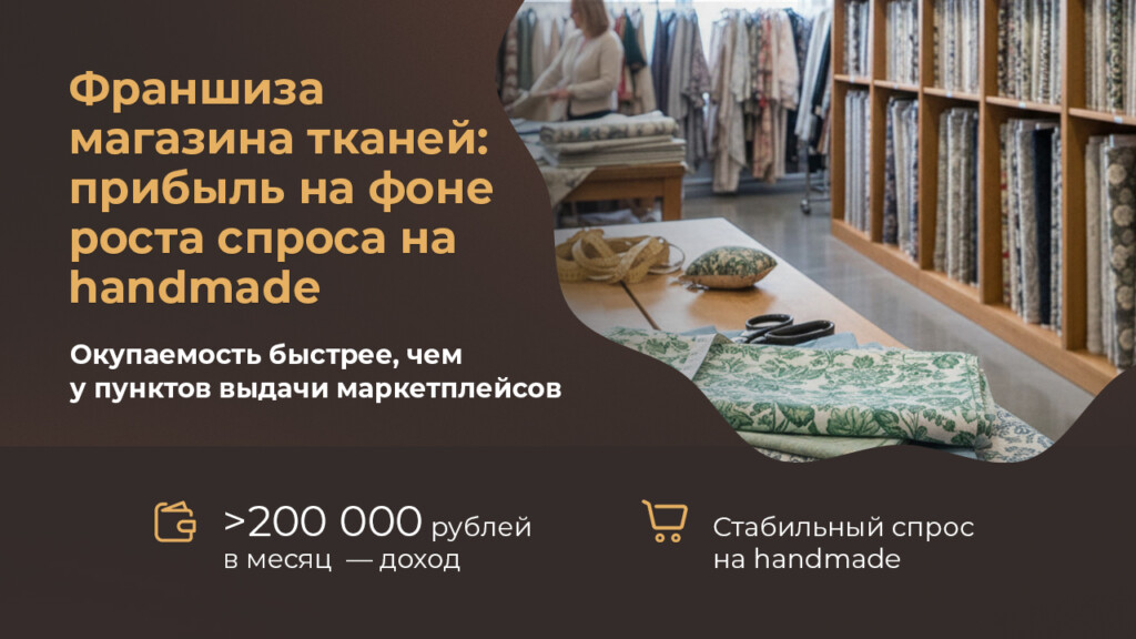 ФрейяСтоимость360 000 ₽Инвестиции958 500 ₽Окупаемость5 мес.Доход200 000 ₽Фрейя — магазин тканей, фурнитуры и товаров для рукоделия с брендом, который ценят мастера и рукодельницы. Доход от 200 000 рублей и окупаемость при грамотной локации уже через 5 месяцев. Вы получаете готовую бизнес‑модель: оптовые закупки в Краснодаре + эксклюзив из Екатеринбурга, маркетинг в Telegram‑канале, акции для клиентов, лояльную аудиторию и растущий спрос на ручную работу. Всё, что нужно — помещение и желание развивать дело. Показать больше