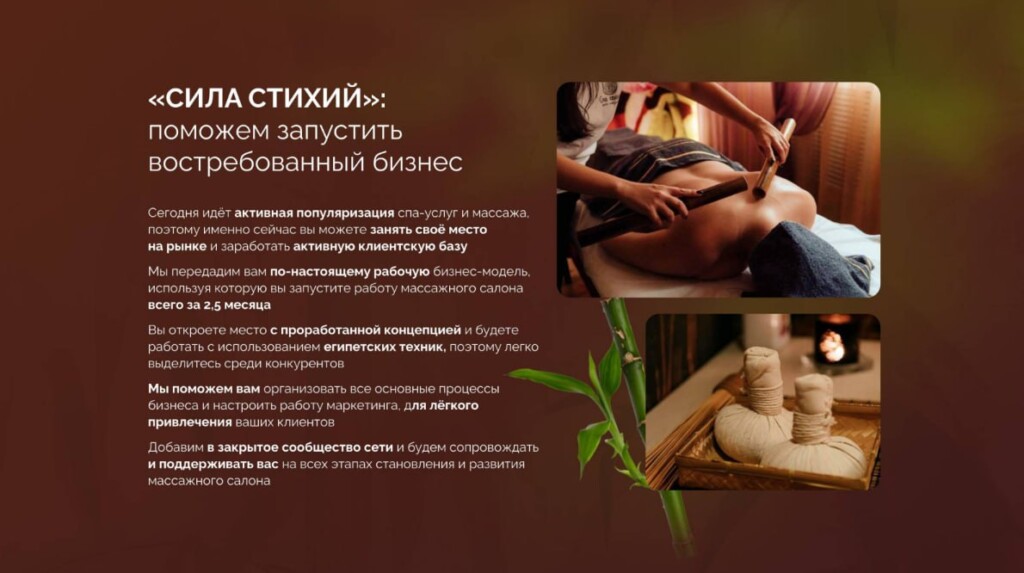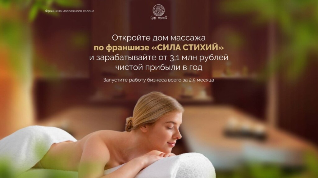 Сила СтихийСтоимость300 000 ₽Инвестиции1 200 000 ₽Окупаемость7 мес.Доход200 000 ₽«Сила Стихии» — место, куда приходят за глубоким восстановлением. Интерьер в эстетических тонах, тихая музыка, мантры — всё создано для полного погружения в атмосферу спокойствия. Мы предлагаем обширный выбор СПА-программ и уникальный египетский массаж для восстановления гармонии тела и духа. Франшиза предоставляет полностью готовый бизнес-формат: стандарты обслуживания, обучение персонала, дизайн, маркетинг и сопровождение. Создайте в своём городе точку притяжения, куда люди захотят возвращаться снова и снова. Показать больше