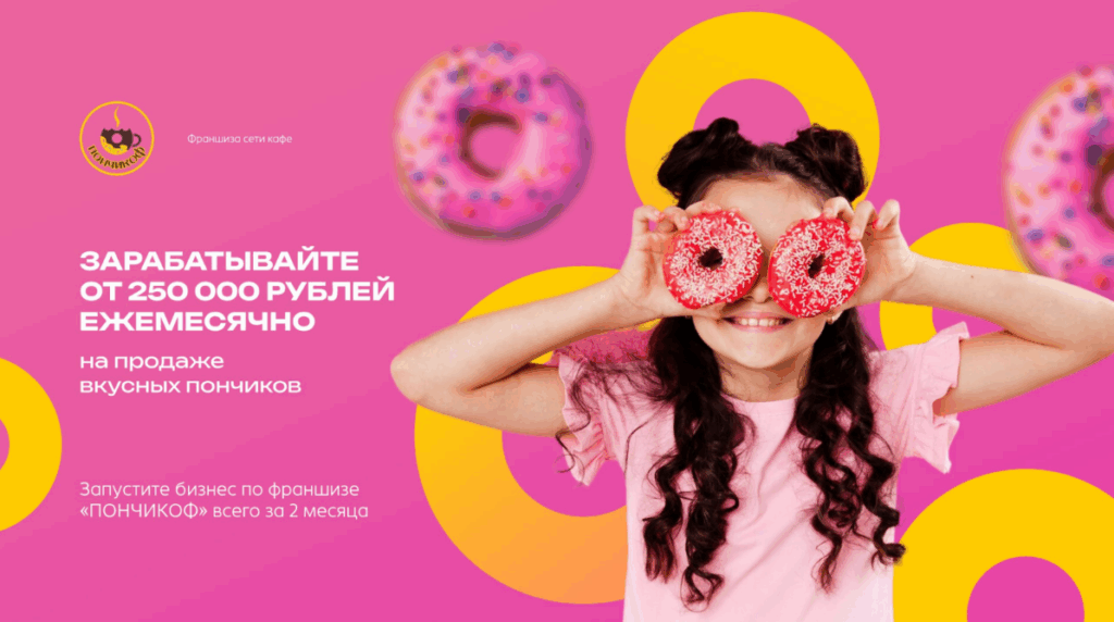 ПончикофСтоимость360 000 ₽Инвестиции1 800 000 ₽Окупаемость16 мес.Доход250 000 ₽Пончиковая «Пончикоф» — бизнес, который невозможно пройти мимо. Пышные, горячие пончики с щедрыми начинками, которые становятся вашим фирменным отличием на рынке. Производство устроено так, чтобы вы могли работать быстро, стабильно и с минимальным штатом, обеспечивая постоянный поток клиентов. Формат универсален: островок в ТРЦ, небольшое кафе или точка навынос. Это бизнес, который дарит людям эмоции, а вам — регулярный доход уже в первые месяцы. Показать больше